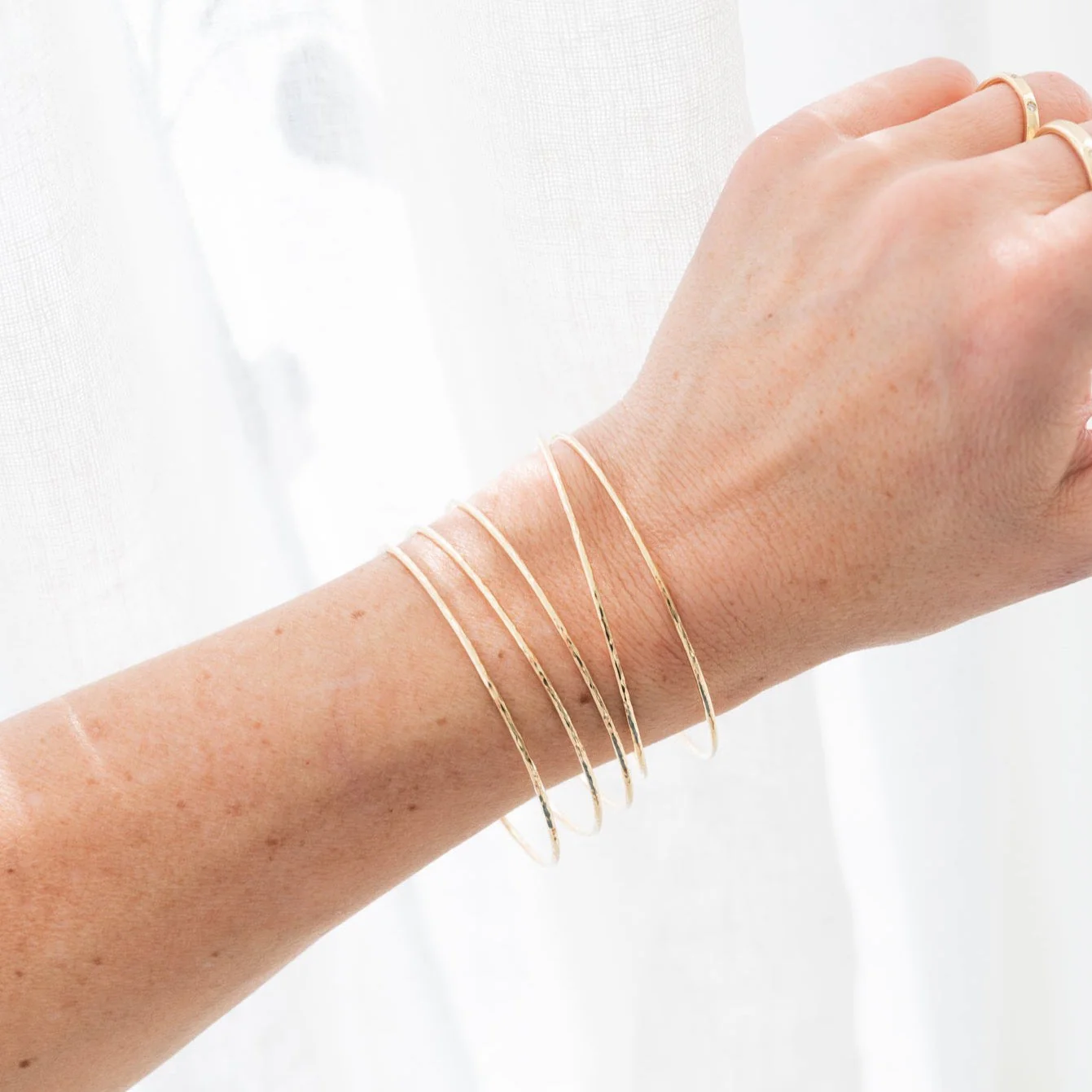 Our Heavy Weight bangle finished by hand with a hammered texture. A perfect bangle for representing a year that required toughness and strength. 1.6mm round solid 14k round bangle with a hammered finish.