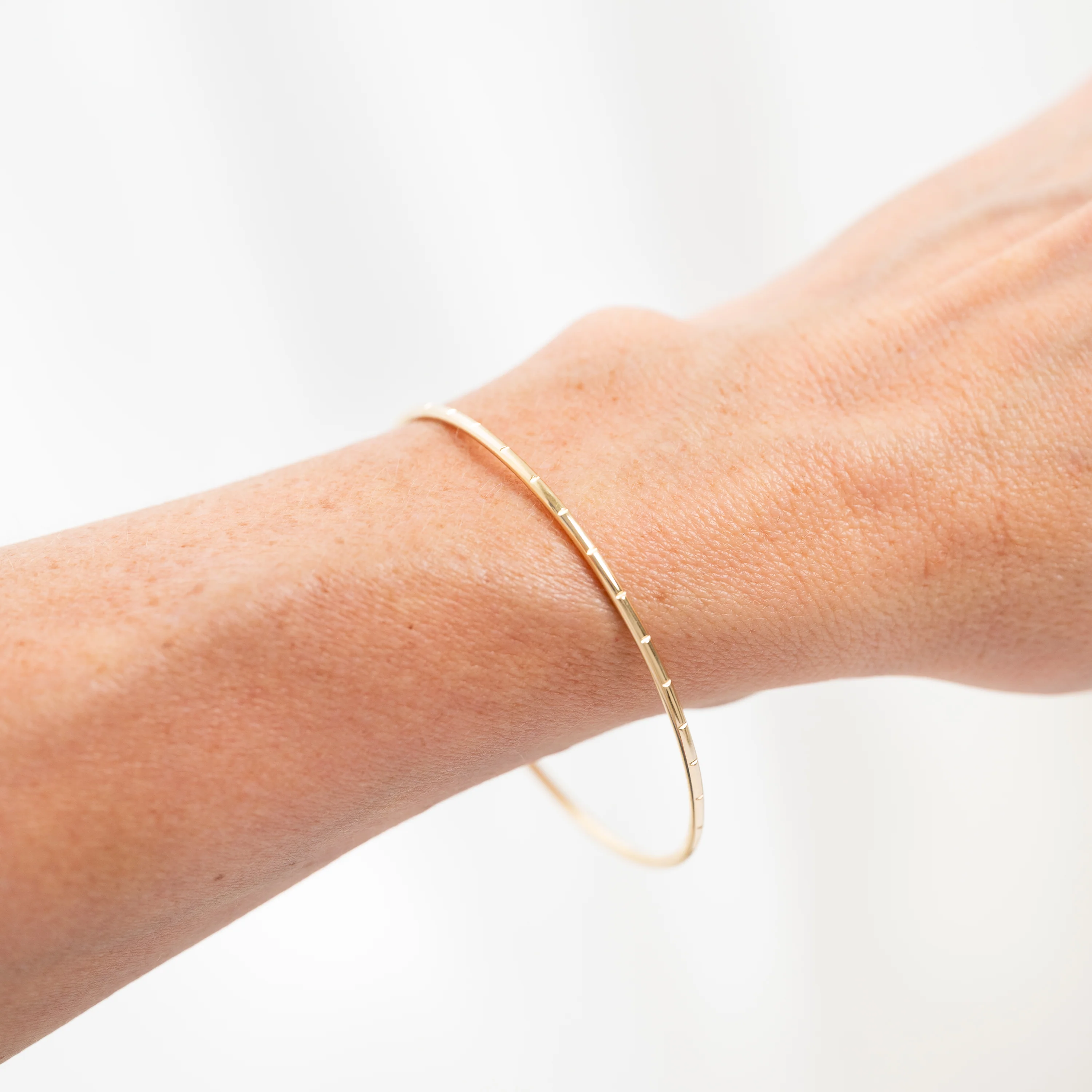 Evenly Spaced: Without a specific number or pattern, notches are spaced evenly around the bangle for a classic textured look.