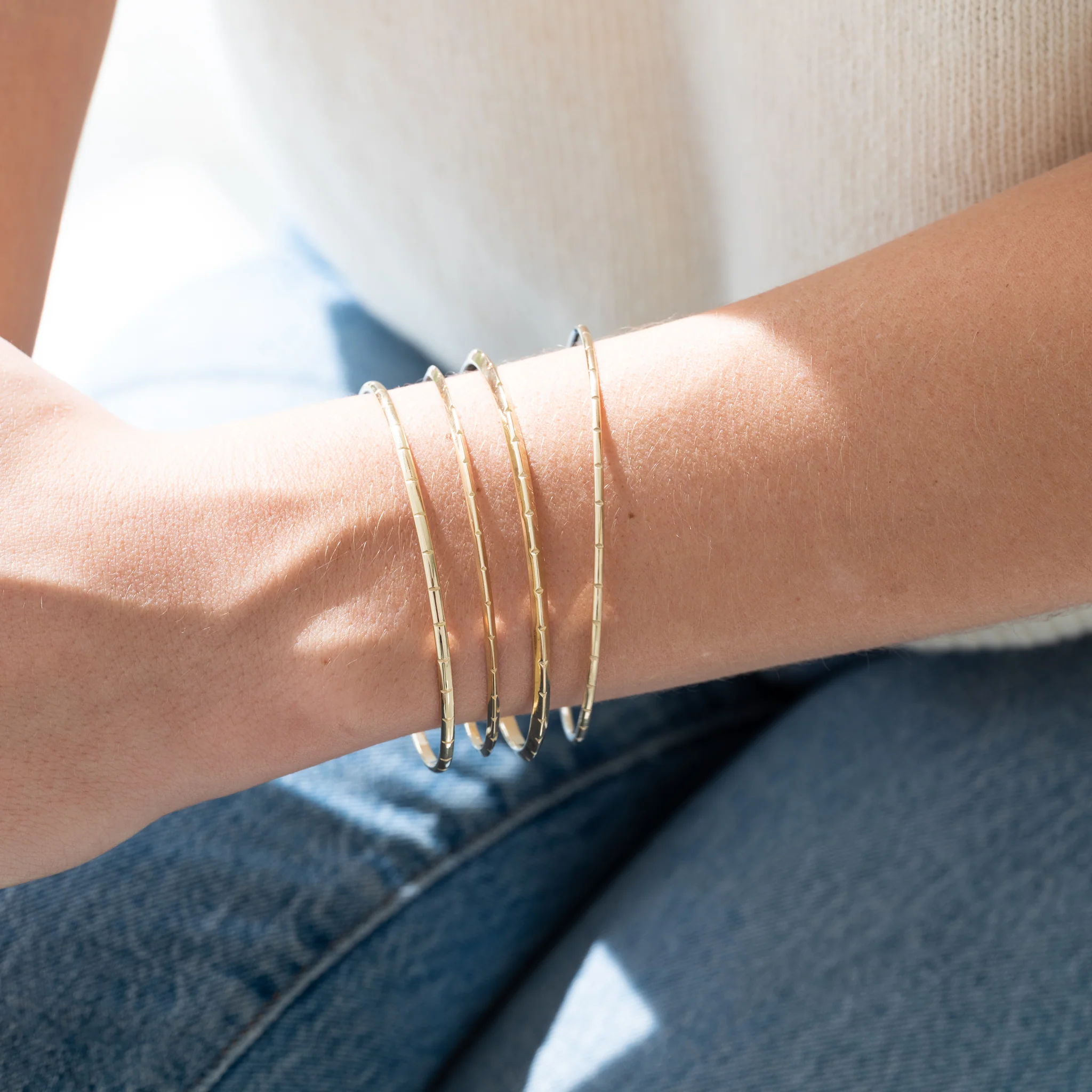 Evenly Spaced: Without a specific number or pattern, notches are spaced evenly around the bangle for a classic textured look.