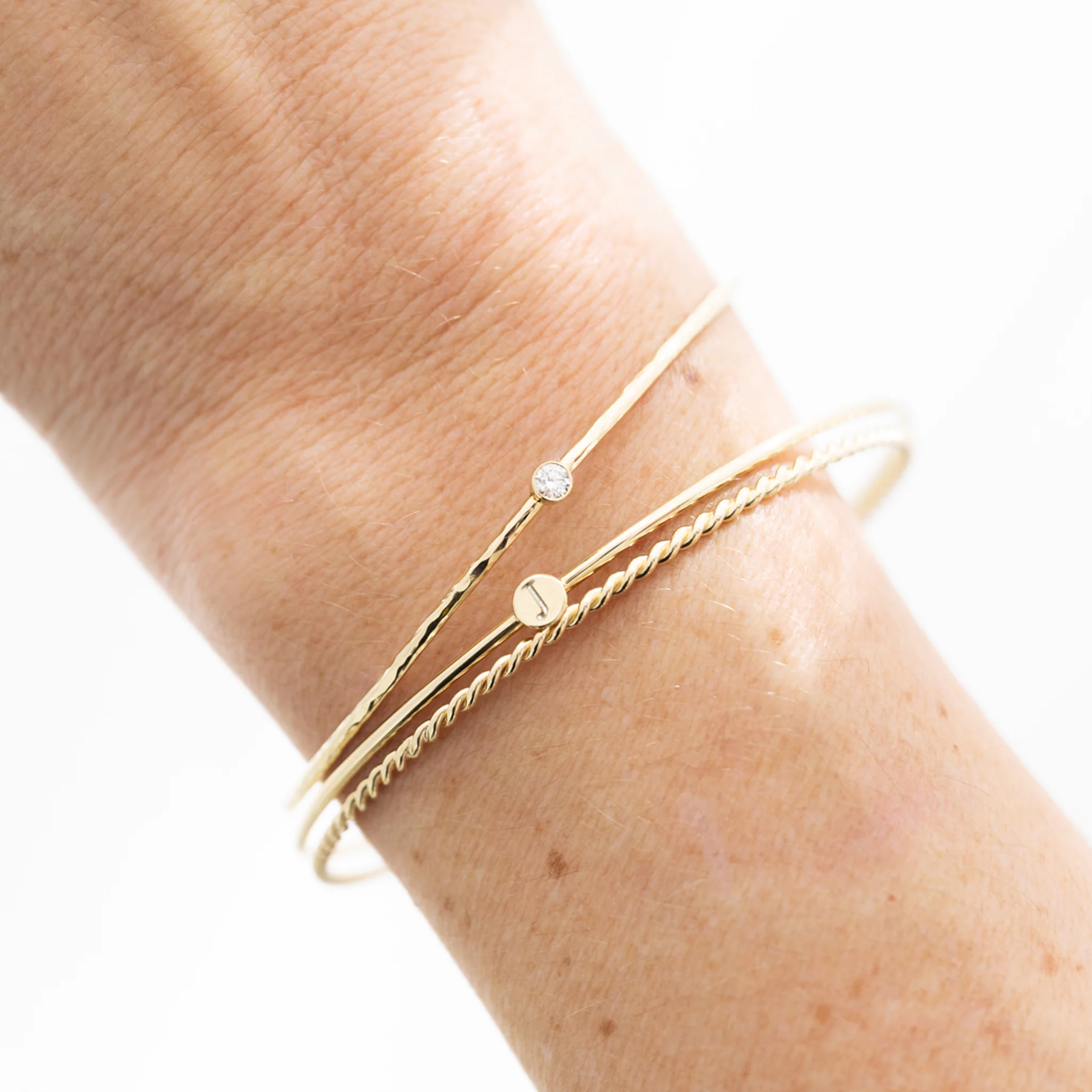The Original (1.3mm) or The Heavy Weight (1.6mm) solid 14k gold bangle customized with a hand-stamped letter or number.